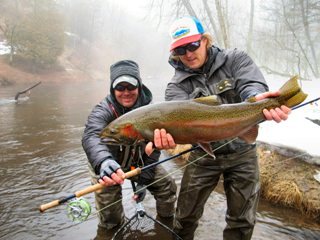 After the Midwest Fly Fishing Expo ended yesterday, friend Mike Schmidt, owner of Anglers Choice Flies, and I drove four hours north to Baldwin, Michigan located on the banks of the Pere Marquette River. We’re steelhead fishing tomorrow! However, what started as an enjoyable drive ended difficult. As we traveled north it not only got dark but thick fog from melting snow mixed with drizzle and rain made it nearly impossible to see the roads. We arrived late at 10 PM. Luckily the neighborhood pub was open for food and I devoured a delicious grilled walleye dinner.