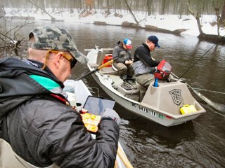 Soon we anchored next to Schultzy and Mike. Then I watched the boys build the weirdest nymphing rigs I’ve ever seen. Strange as the rig is, it’s ideal for winter Great Lakes steelheading. The leader is terribly long yet carefully weight balanced with not one but two clumps of split shot. Attached about 18” apart are two different colored egg flies and the entire bundle gets suspended by an enormous bobber that resembles something I once used crappie fishing at night in Wisconsin thirty years ago.