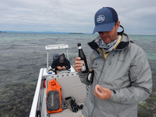 Skies remained hidden beyond a thick layer of clouds and the wind still blew from the north at around 20 mph. But the rise in temperature was key. Immediately we saw permit and at 8 am I dropped my fly a foot from a hefty waving permit tail. Like magic the permit seized my fly but in less than ten seconds of his run, he severed my leader on coral. Wil Flack reached into his Yeti and handed me an early morning Belikin while I examined my leader and announced, “Progress in the right direction”.