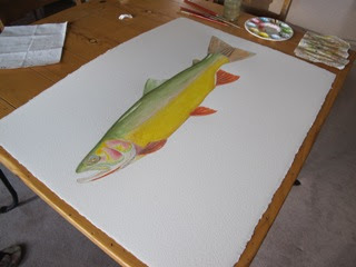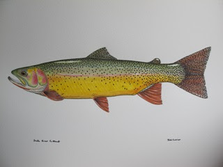 It looks like all I do is fish, but I actually stay pretty busy very early in the mornings before fishing and then very late at night after fishing. This week I have been working on a huge Snake River Cutthroat painting. Today I finally put on the finishing touches and I’m pleased with the final product. The watercolor pen & ink is 22” x 30” in size and I sell it unframed for $1250 plus $30 shipping. Unless I sell it in the next 48 hours, it will be headed to the framer and then to Wyoming Gallery in Jackson, Wyoming (307 733-7548) where I display and sell my work.