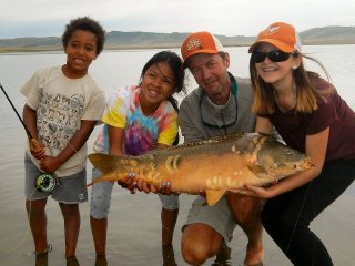 I made the right choice being sure to get this hefty carp in rather than let the kids have at it.  No doubt they were in awe that such fish exist in Idaho.  After some fantastic photos the kids up righted the carp in the shallows and gave him a nudge.  Seconds later all three were doused by the rooster tail the massive carp left on his return to Blackfoot Reservoir.