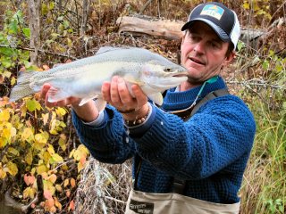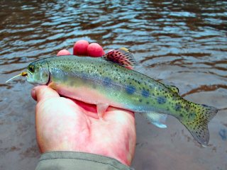 While the locals advised fishing egg patterns Rick and I went with streamers.  Neither of us is much into fishing egg patterns.  However, after I fished a great looking run without a fish, I put on a favorite Vladi Trzebunia nymph of mine and immediately dredged out a rainbow.  This was my first fish on a nymph in a long time and I was delighted.  Today is my birthday and I catch a fish every year on my birthday.