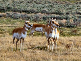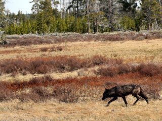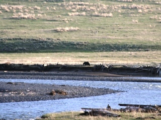 We made it to Lamar Valley at around 7. As always there were plenty of pro wildlife viewers stopped in many of the viewing points with their high-powered spotting scopes. Granny and I visited a few but they all said animal sightings had been slow for several days. Then, as I was talking to one of them, I noticed some very nervous pronghorn antelope. I looked the same way the antelope were looking and across the Lamar River I saw a dark spot. It was too small to be a buffalo and I hit it with the binocs. Sure enough, we had our first grizzly bear sighting of the weekend.