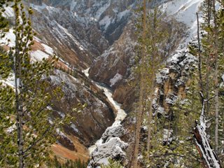 Before we left the Park the weather broke again. The sun came out and we went for a side trip over to Hayden Valley, another great grizzly viewing area. We drove as far as Canyon only to come to a road block. The road was closed due to snow. Bummed but wanting to make the best of things, we did a short hike for a unique view of Yellowstone Falls that we’ve never done before. The Grand Canyon of Yellowstone really is incredible.