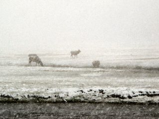 In no time the snow was falling so hard we could hardly see into the meadows of the Madison River where we hoped to spot some animals. Let alone the fact that I didn’t dare take my eyes off the slippery road to even look for animals. There were a few elk braving the storm but that was it.